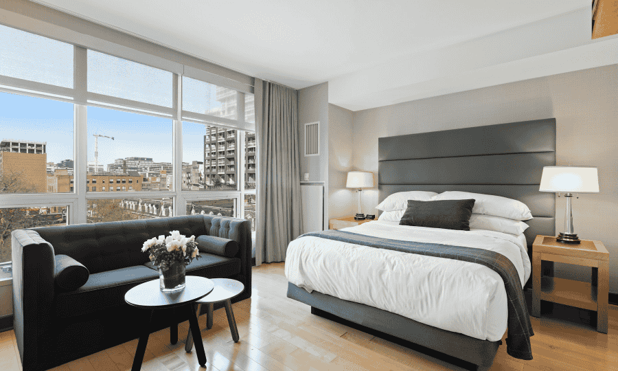 For those needing additional space, the room includes a separate seating area that’s perfect for informal meetings or brainstorming sessions. The en-suite bathroom features a walk-in shower, luxurious toiletries, and soft towels for a refreshing experience.